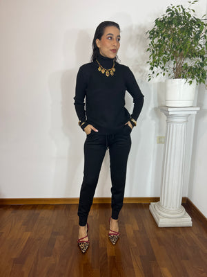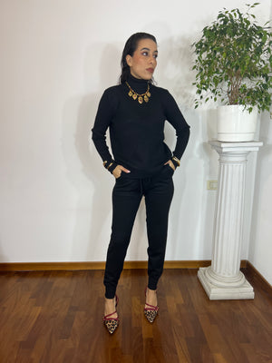 Coordinato due pezzi in maglia composto da maglia a collo alto e pantalone con elastico in vita, realizzato in tessuto morbido e avvolgente.