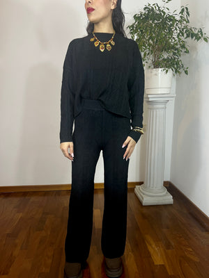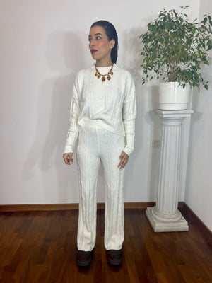 Coordinato in maglia composto da maglione e pantalone a gamba morbida.