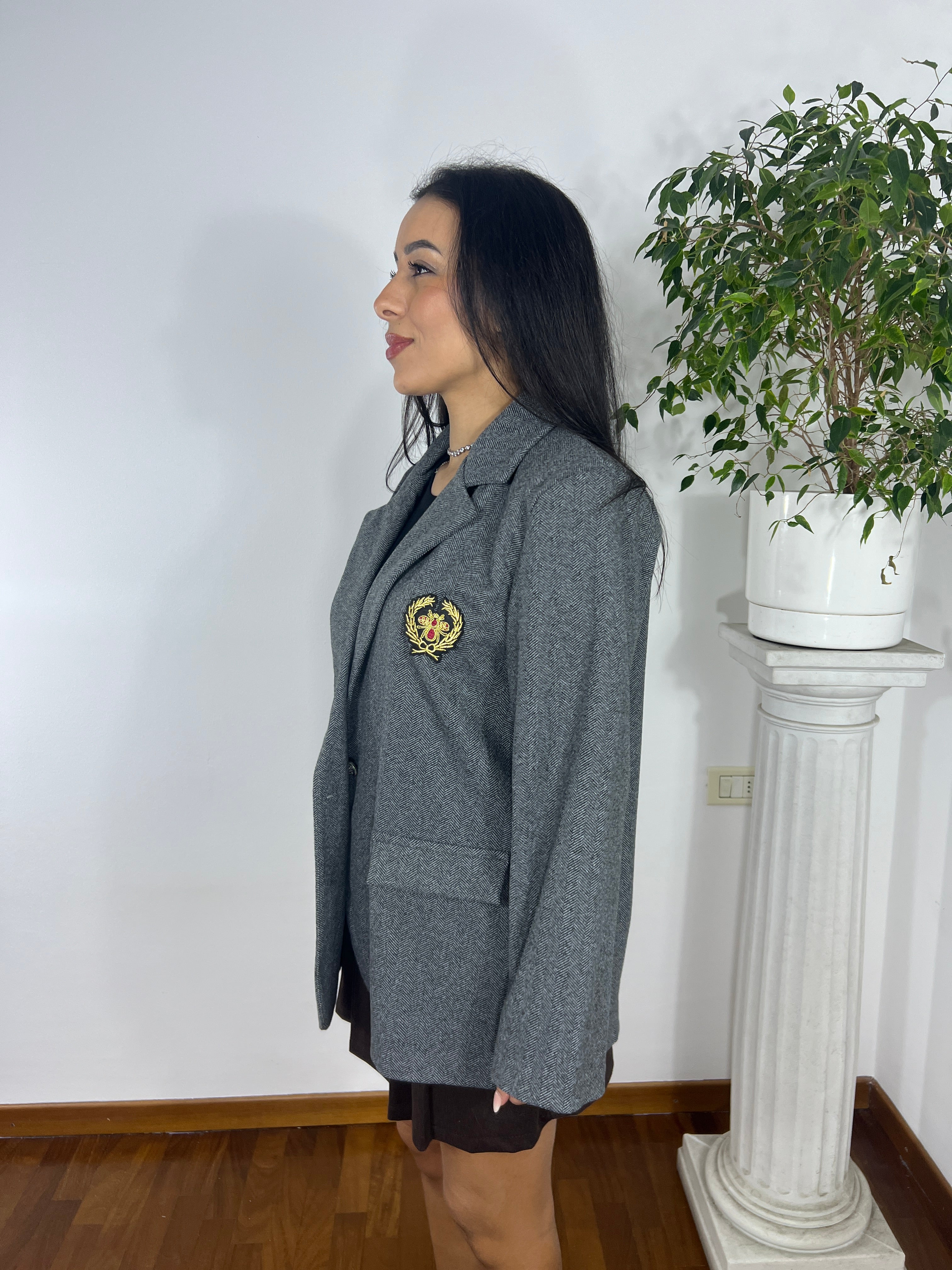 Il modello presenta una linea dritta e leggermente over, con spalle naturali e maniche lunghe dalla vestibilità comoda. La lunghezza copre i fianchi, rendendolo versatile e facile da abbinare sia ad abiti che a gonne o pantaloni.
