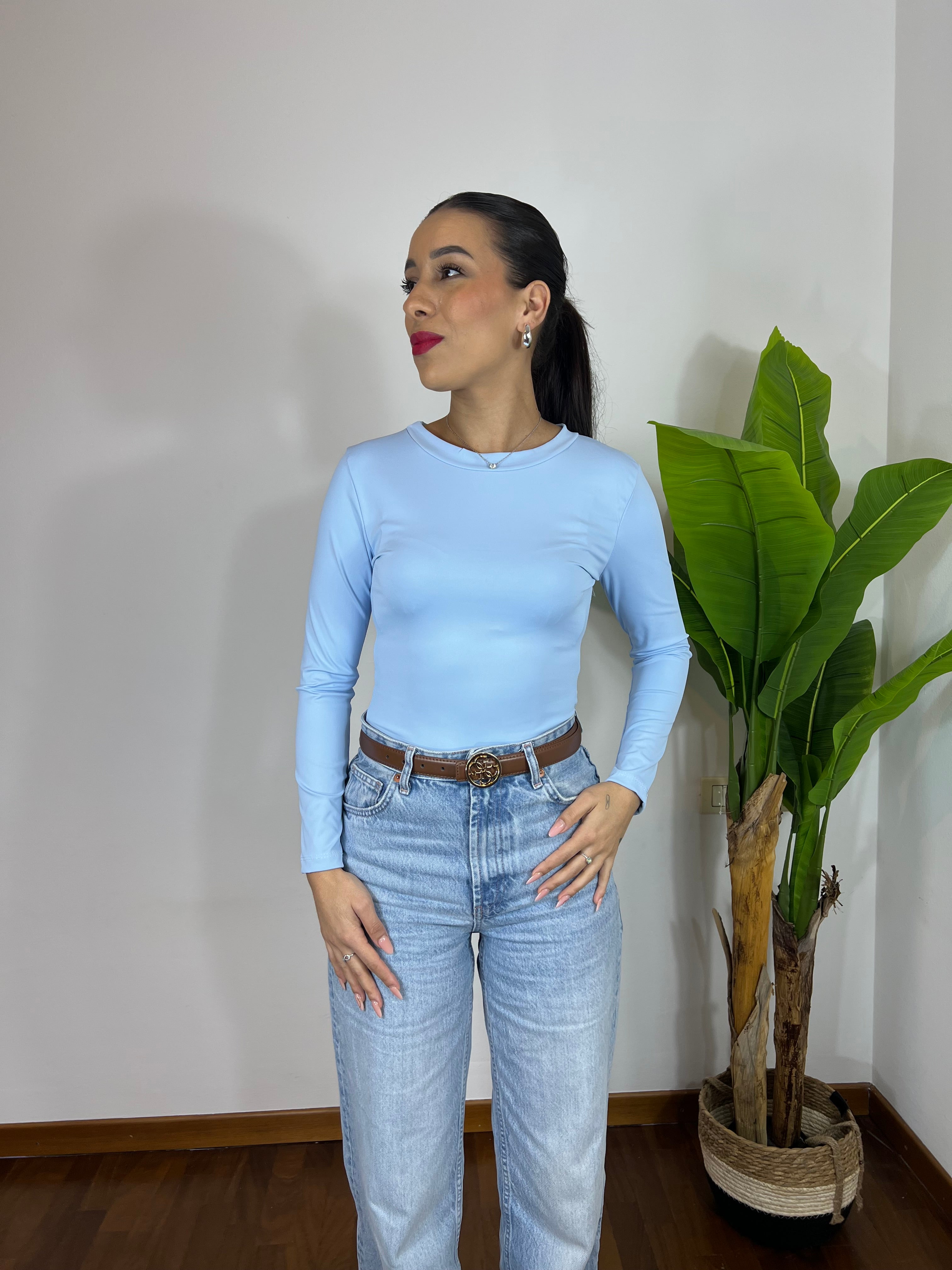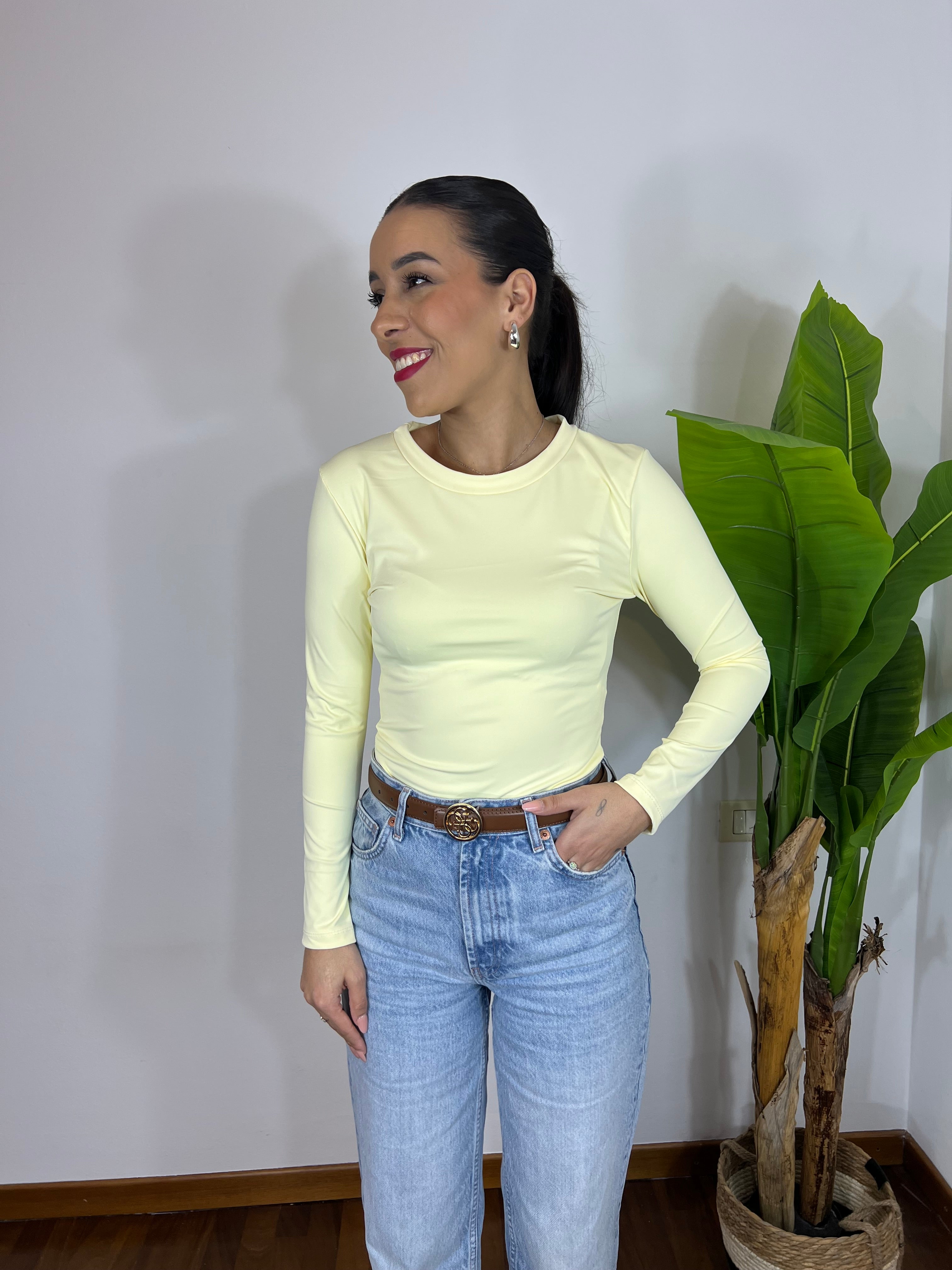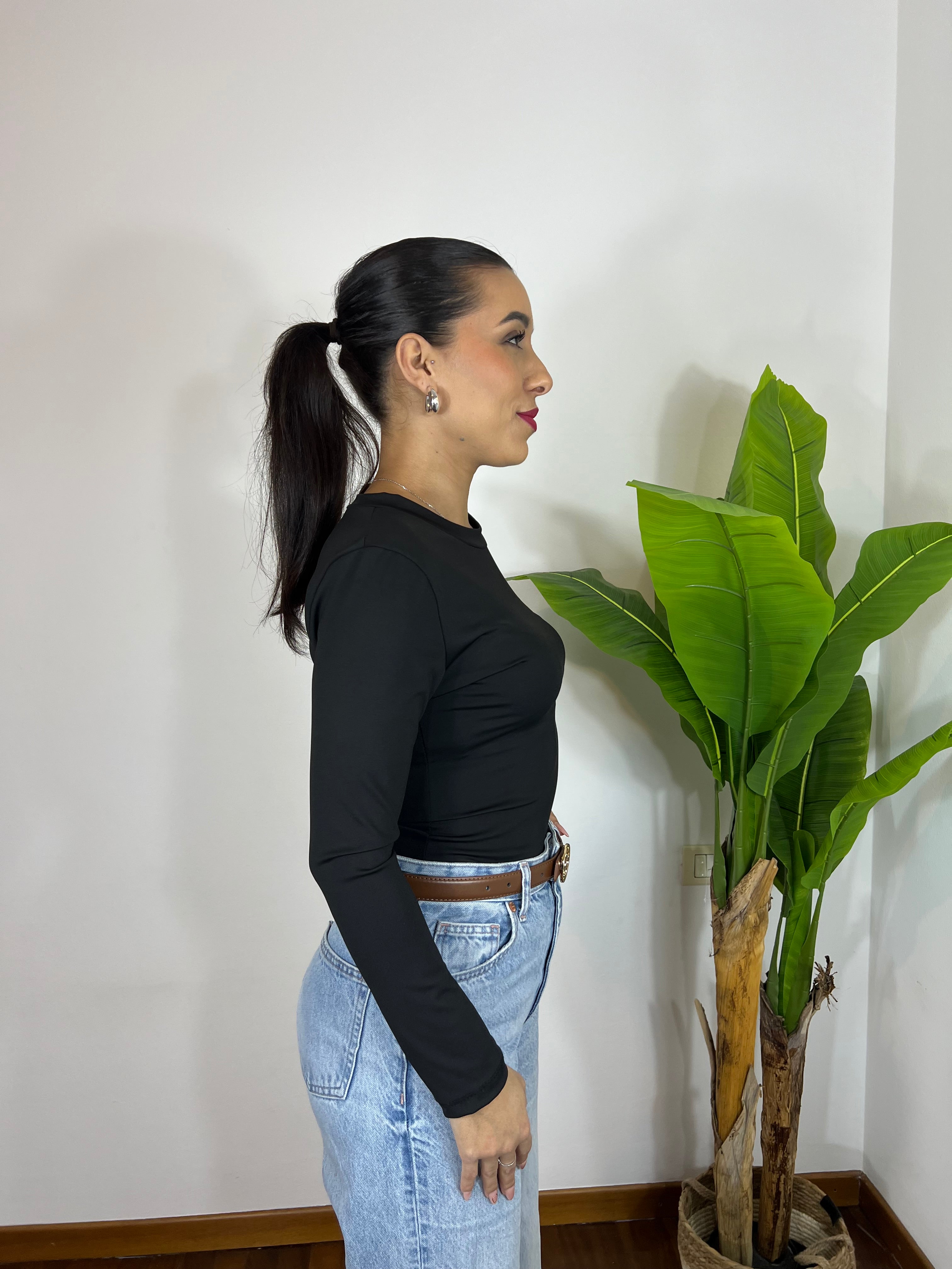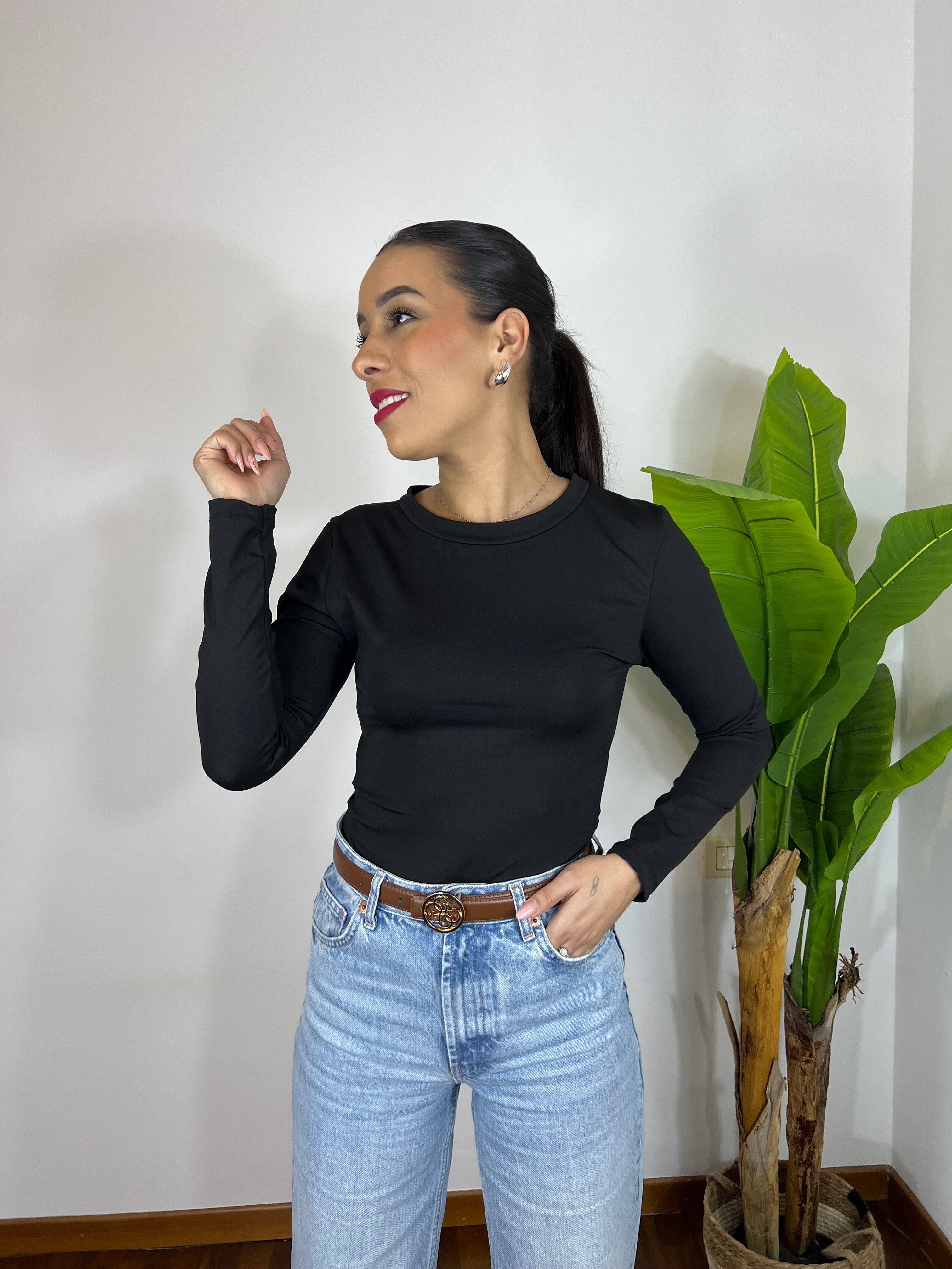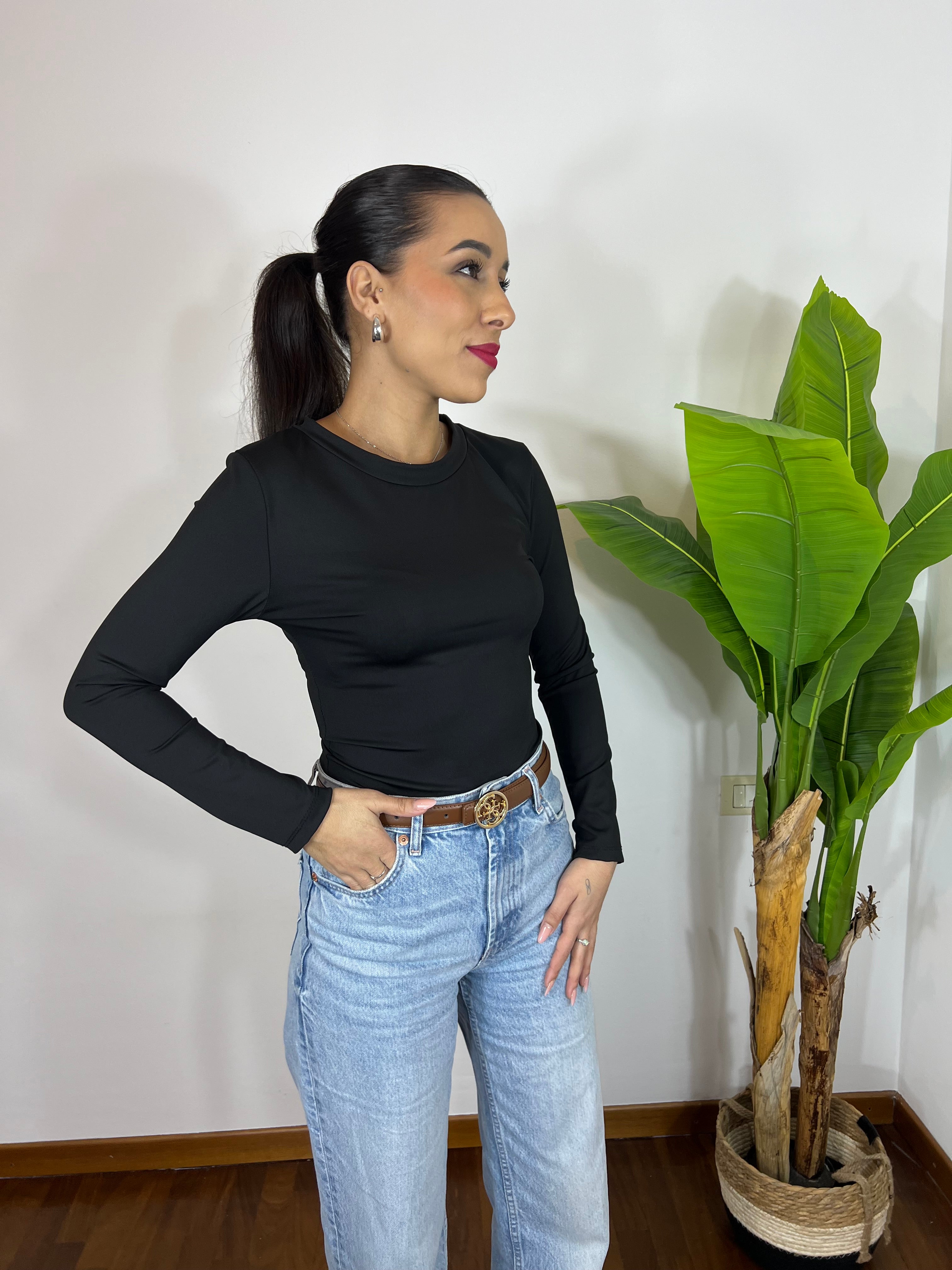 Body a manica lunga in tessuto morbido ed elasticizzato che si adatta perfettamente alle forme, valorizzando la silhouette senza stringere. Comodo, versatile e ideale da indossare con jeans, pantaloni o gonne per look casual o più chic.