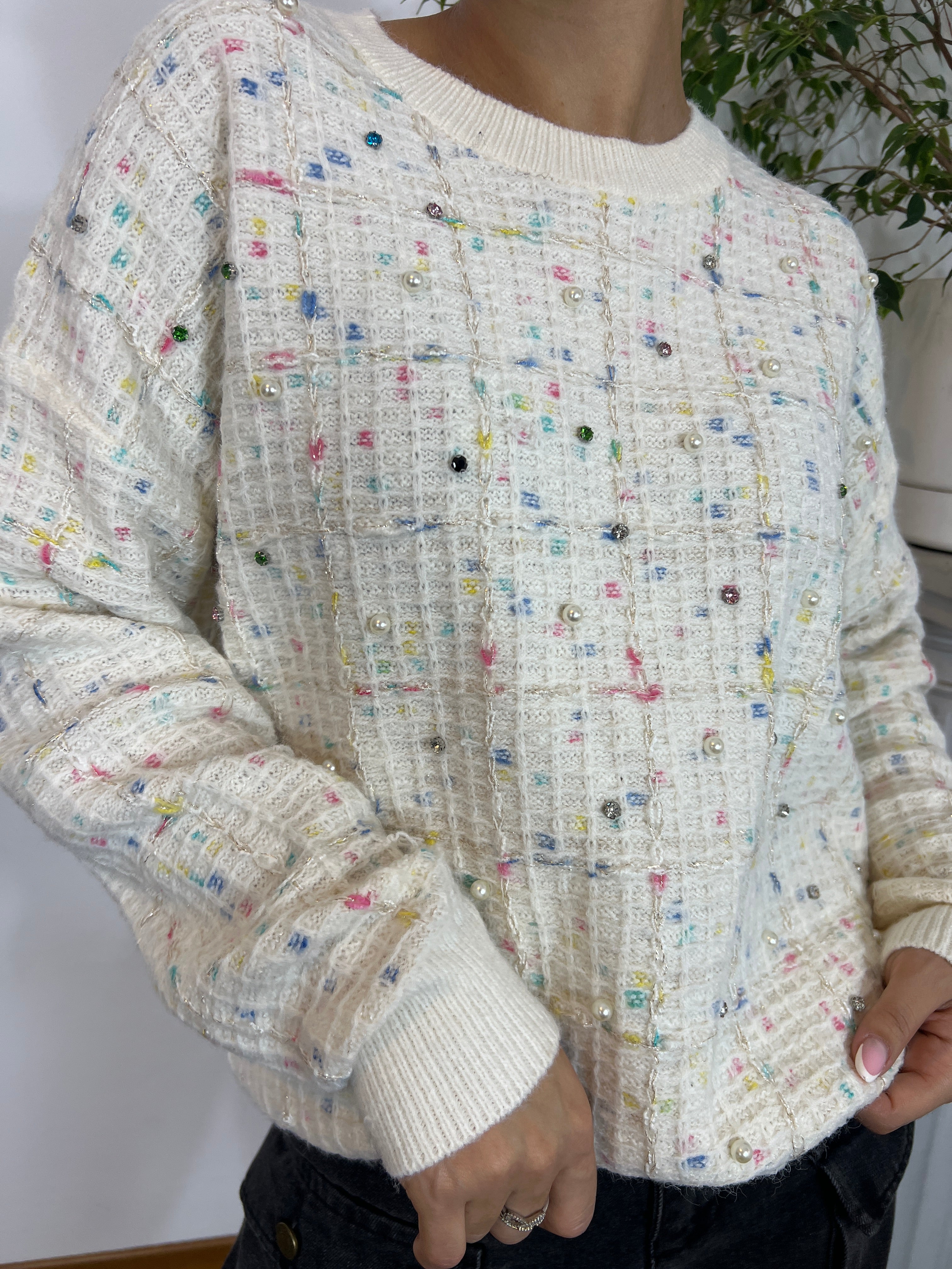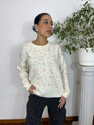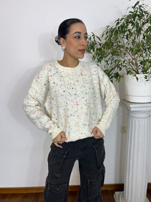 Maglia girocollo realizzata in tessuto effetto tweed, caratterizzato da una trama intrecciata con filati multicolor su base panna. Il tessuto presenta una lavorazione strutturata ma morbida, confortevole sulla pelle e adatta all’uso quotidiano.