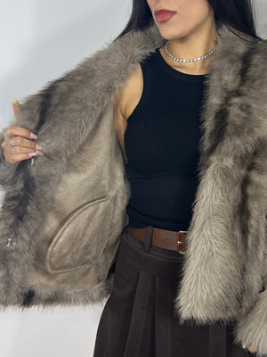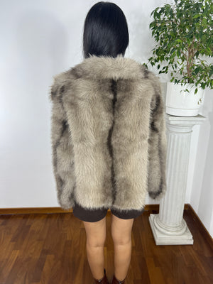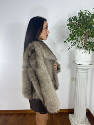 Pelliccia corta in ecopelliccia morbidissima, caratterizzata da una lavorazione a pelo fitto e compatto con leggere sfumature tono su tono che donano profondità e movimento al capo.