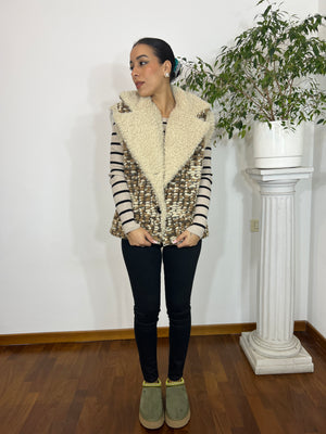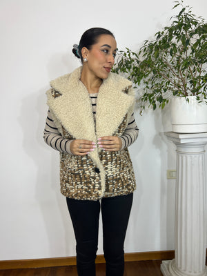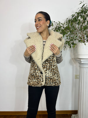 Gilet smanicato dal design elegante e avvolgente, realizzato in tessuto effetto tweed nei toni caldi del beige e marrone. L’interno e l’ampio collo sono rivestiti in morbida ecopelliccia color panna, che dona comfort e un tocco super chic.