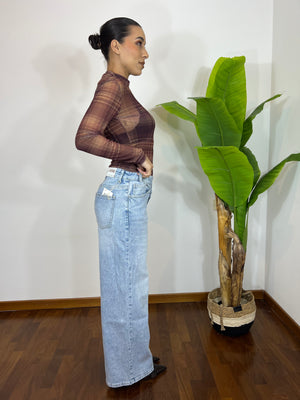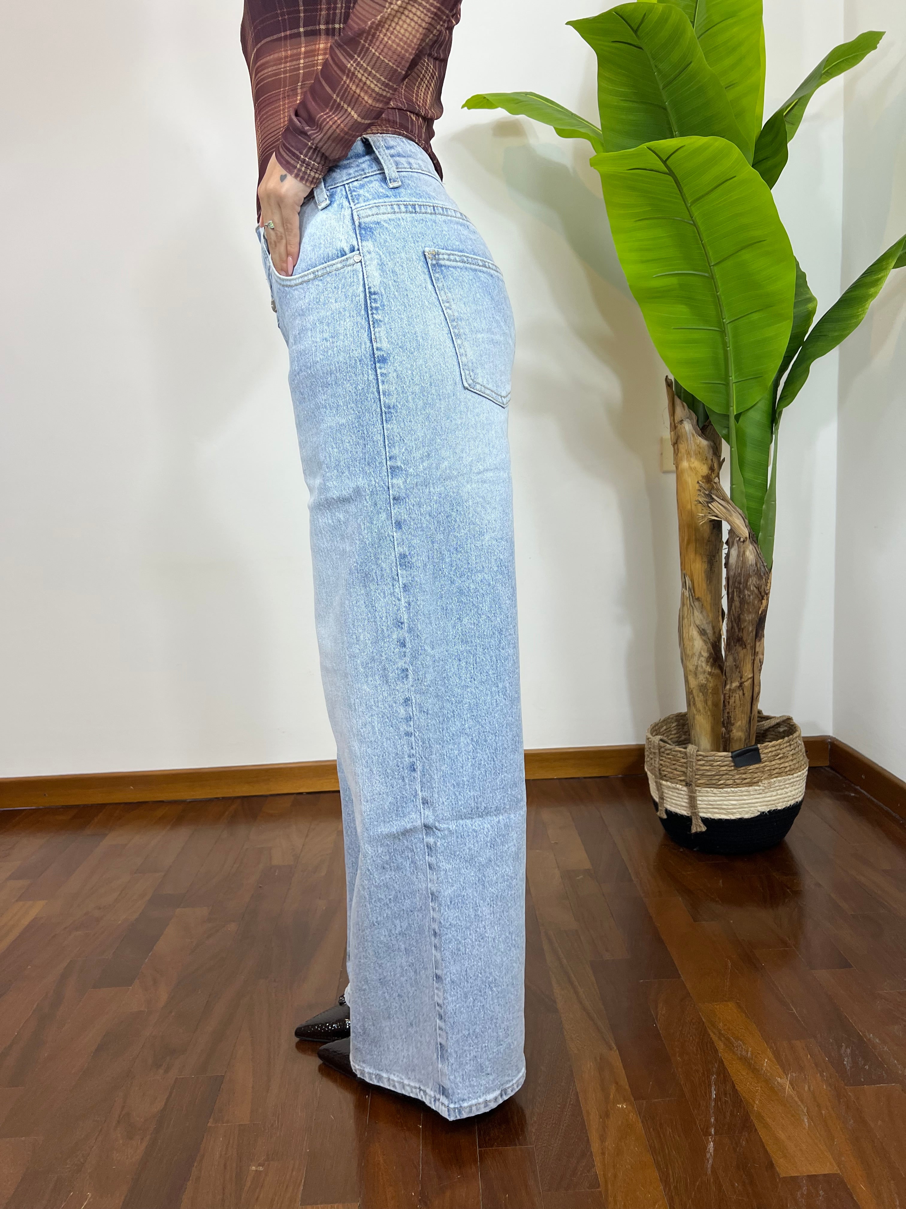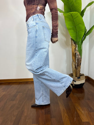 Realizzato in denim lavaggio chiaro, presenta una gamba ampia e fluida che slancia la figura e dona comfort per tutto il giorno. Perfetto da abbinare a top aderenti, body o blazer cropped per un look moderno e deciso.