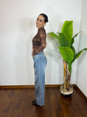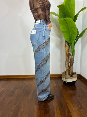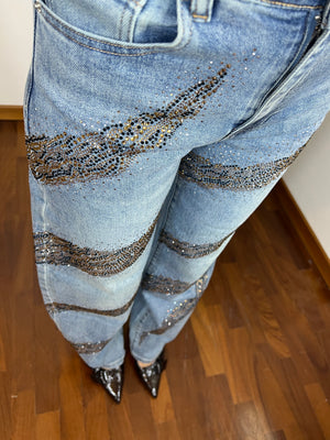 Jeans wide leg dal fit morbido e super trendy, impreziosito da applicazioni luminose effetto onde che donano un tocco glam e originale.