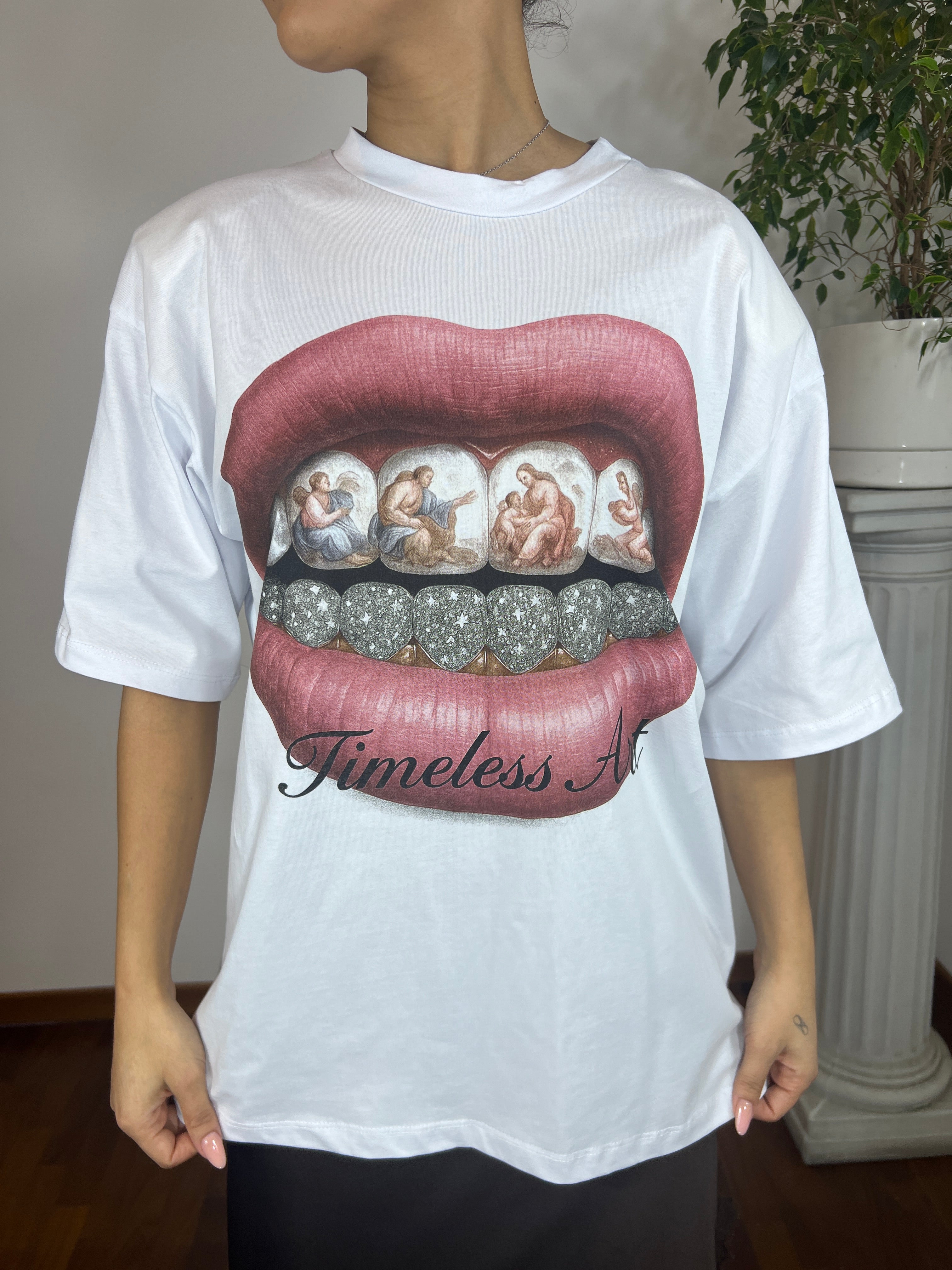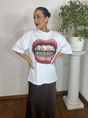 Stampa frontale con grafica labbra e dettagli artistici.