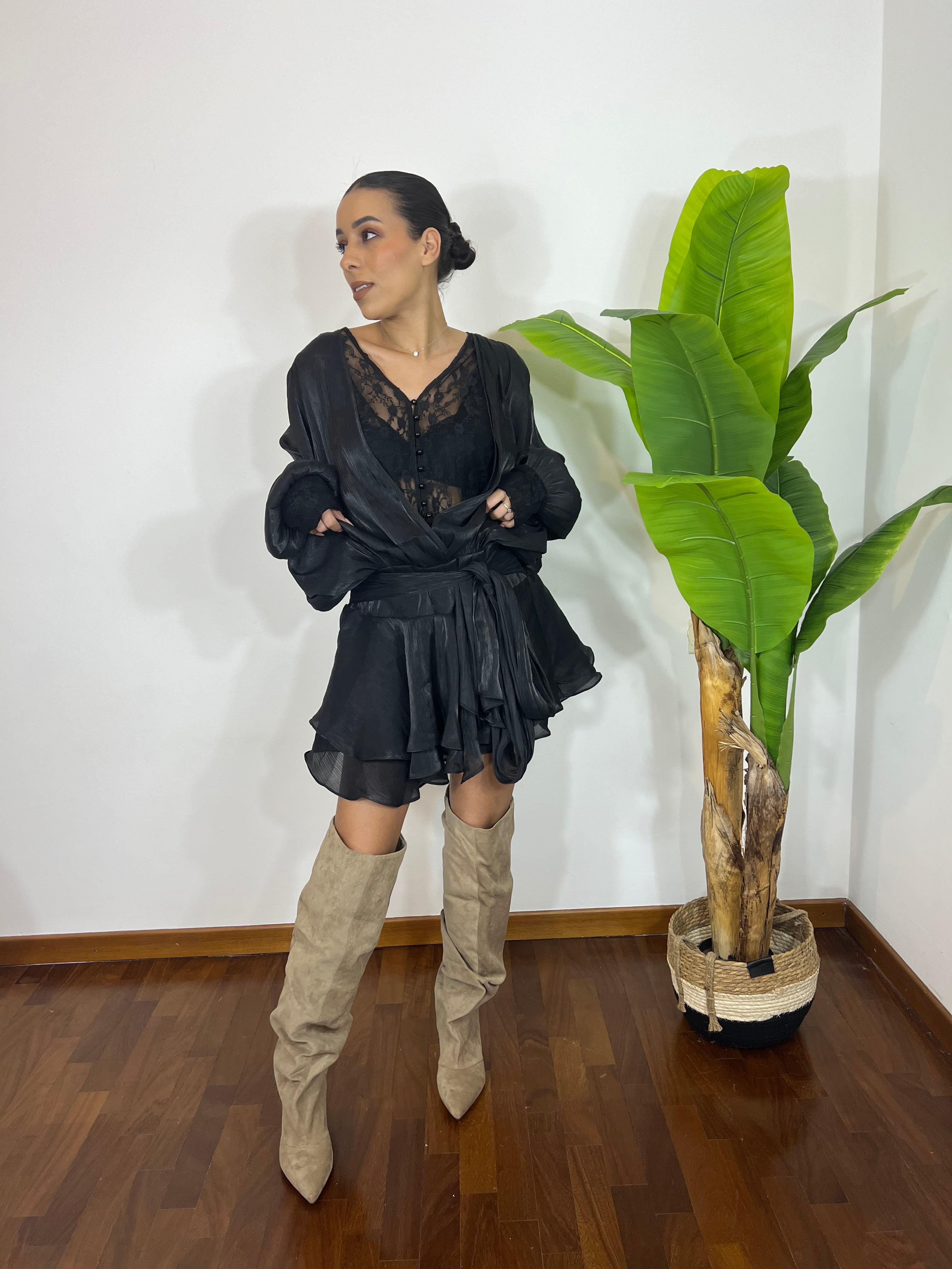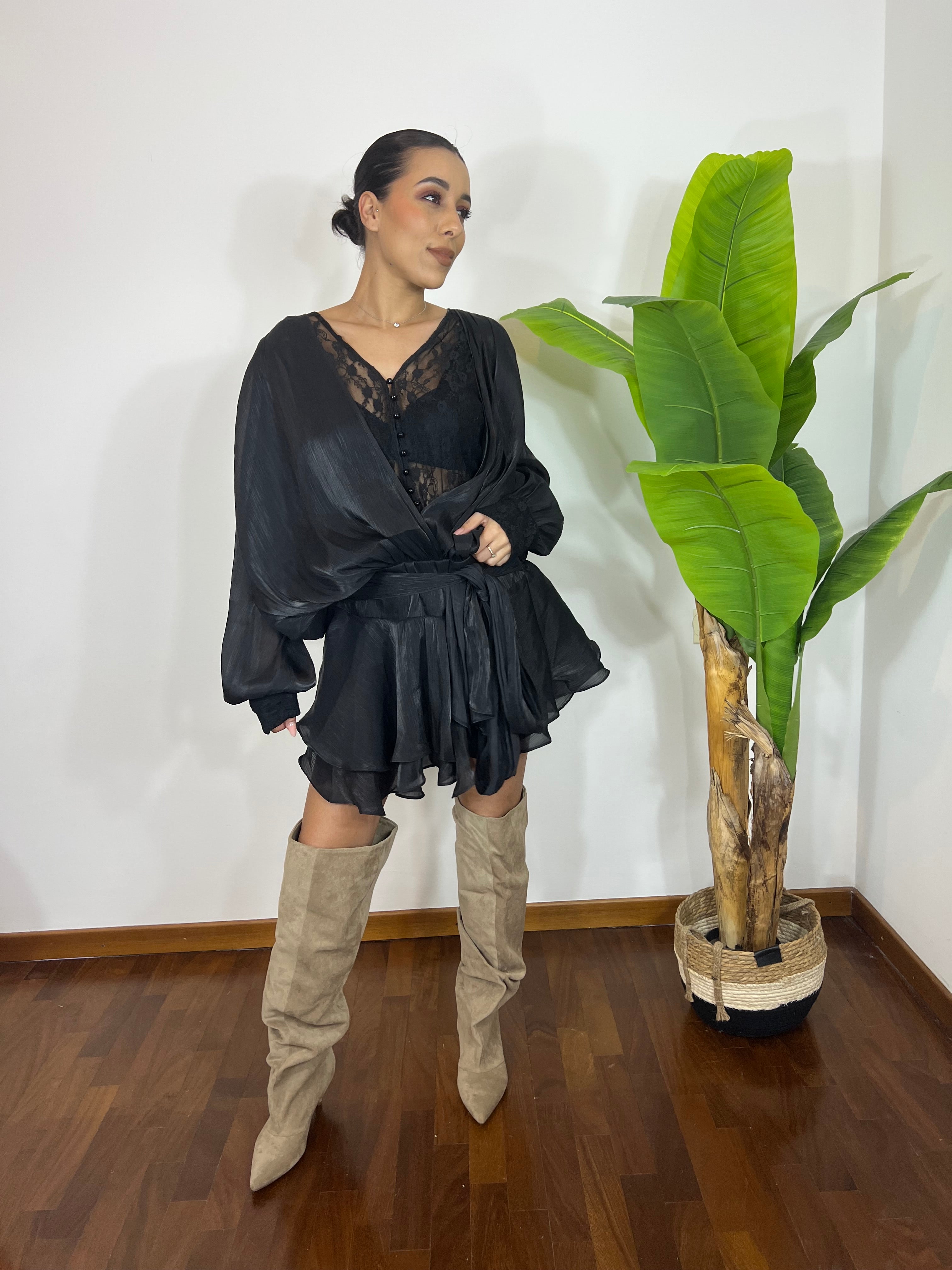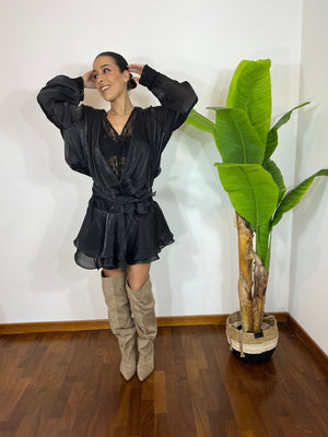 Modello fluido con parte superiore leggermente sfasata che crea movimento e valorizza la silhouette. Il dettaglio in pizzo sul petto aggiunge un tocco romantico e femminile, mentre la gonnellina morbida e sfasata rende il look leggero e super chic.