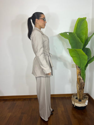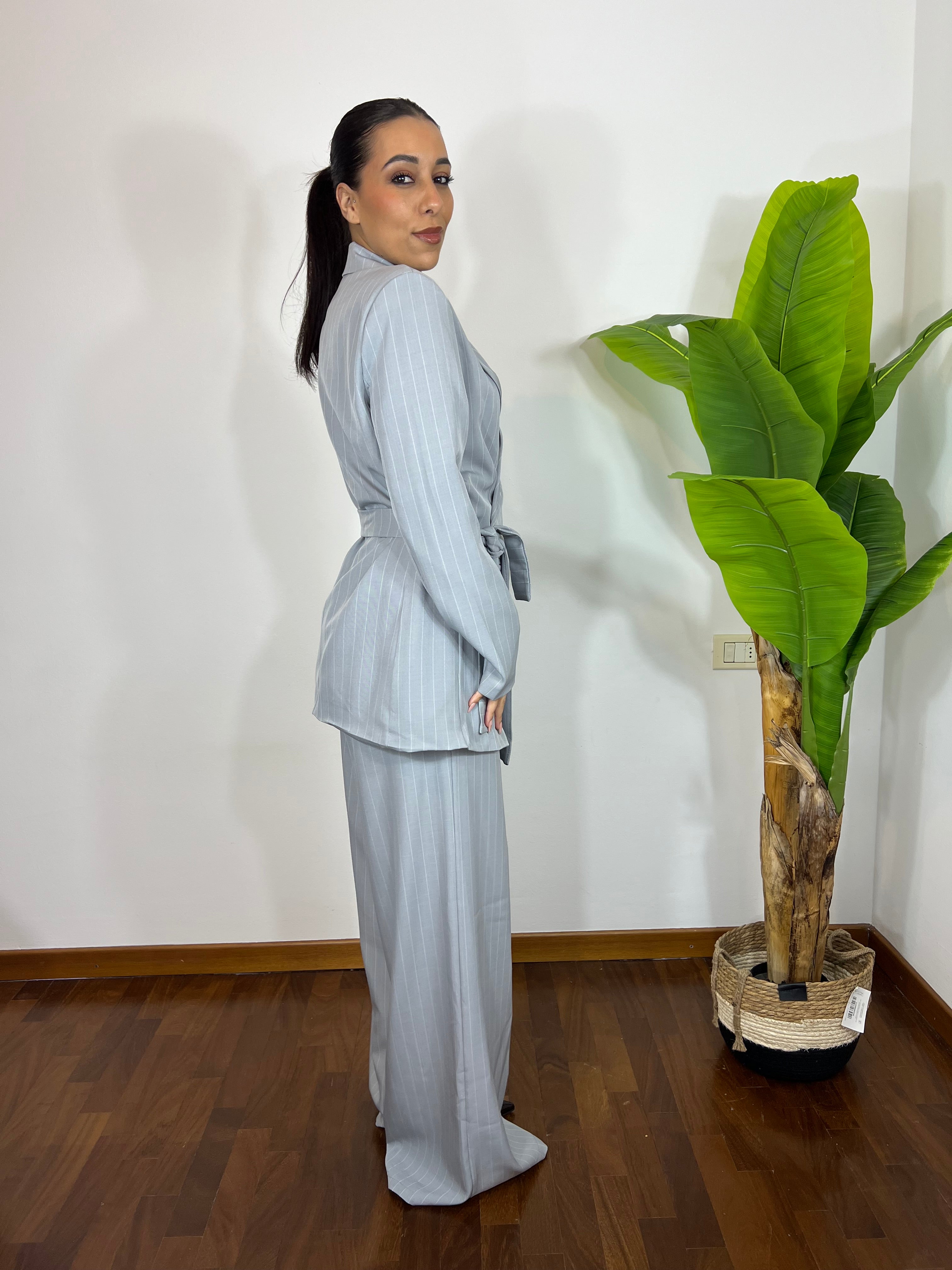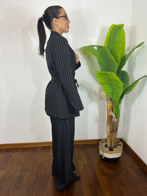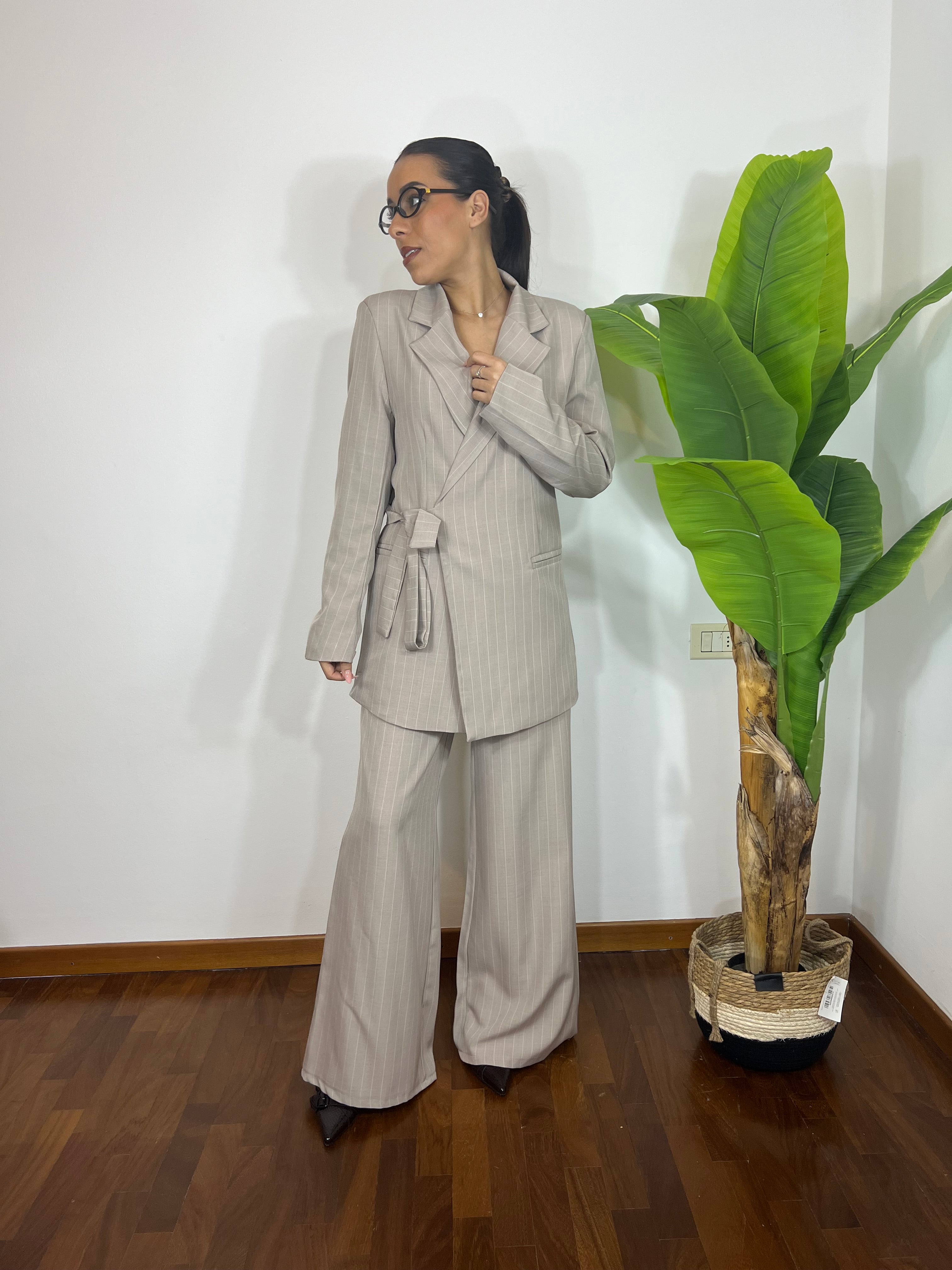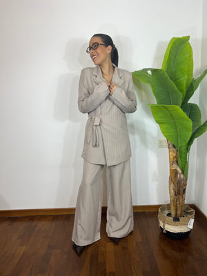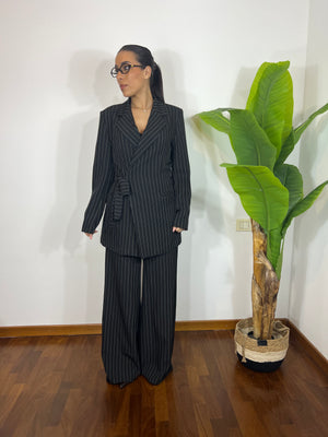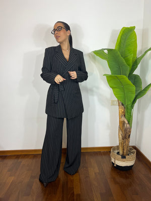 Completo elegante gessato dal taglio oversize, pensato per una femminilità moderna e sicura.
